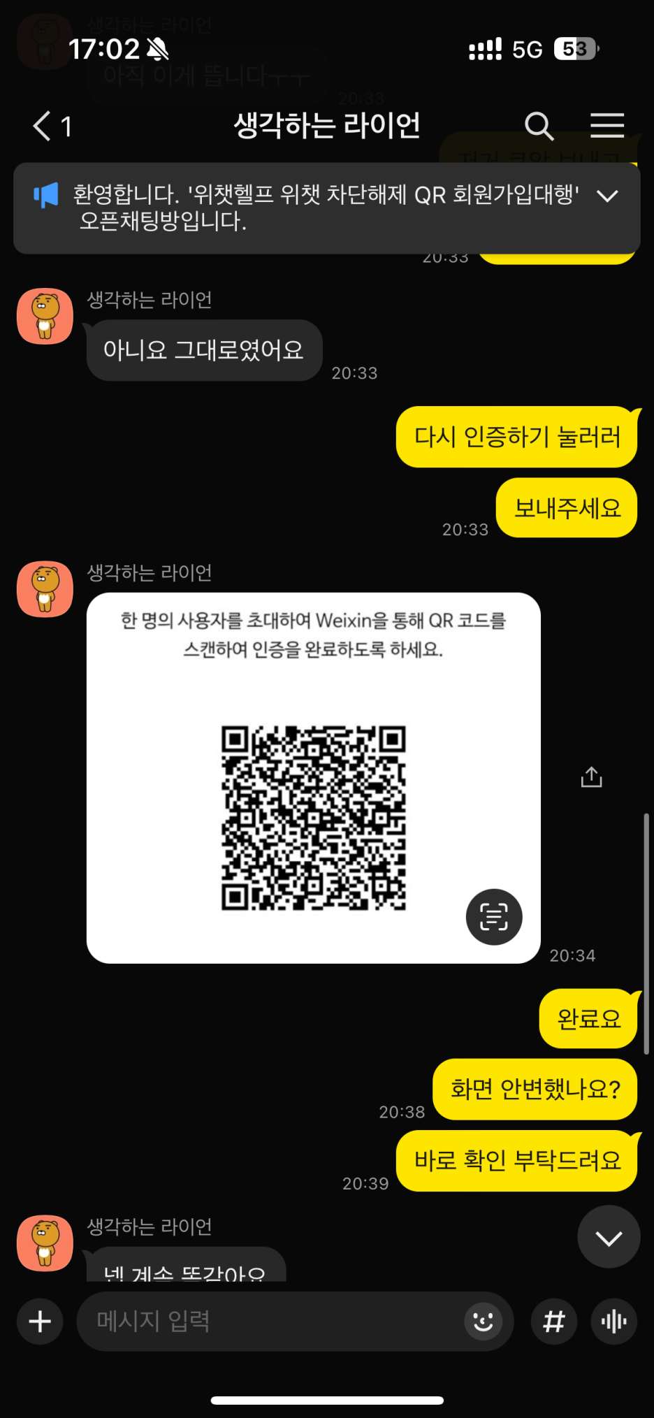 이때 큐알 코드 화면을 끄지 않고 기다려야 합니다.