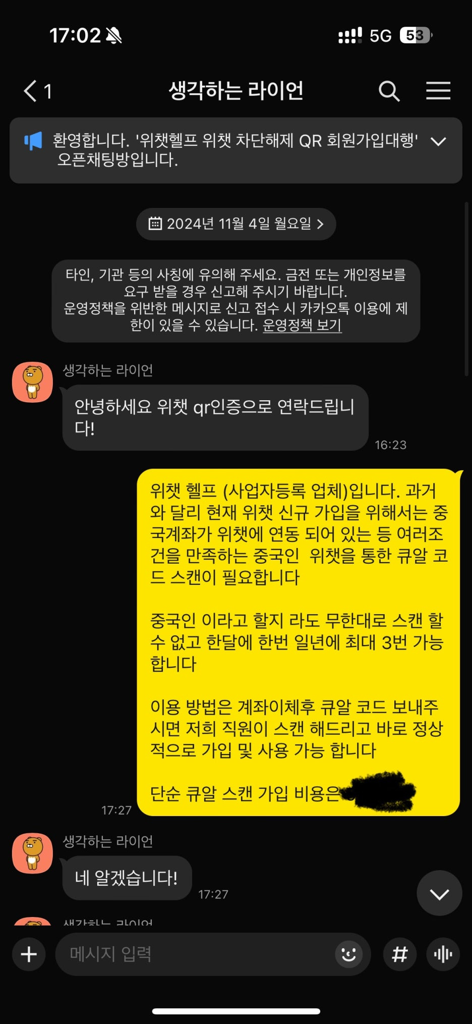 큐알 코드를 보내주시면 됩니다